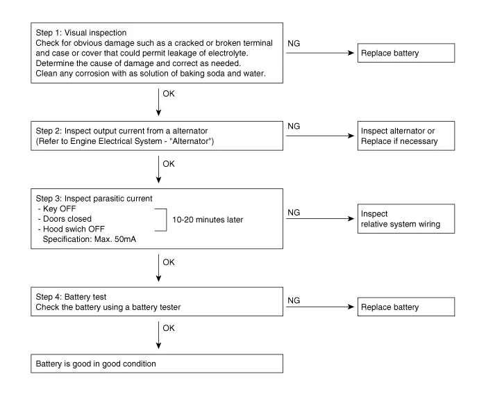 | 6. | Inspect the battery case and cover for cracks. If cracks are present, the battery must be replaced. |