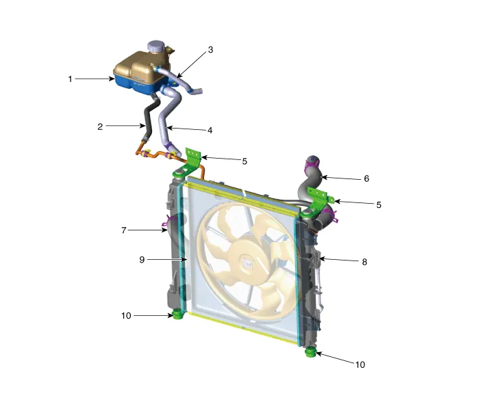 | 1. Reservoir tank 2. Reservoir hose & pipe 3. Turbo charger water drain hose 4. Water return hose 5. Radiator upper mounting bracket | 6. Radiator upper hose 7. Radiator lower hose 8. Radiator 9. Cooling fan assembly 10. Radiator lower mounting insulator |