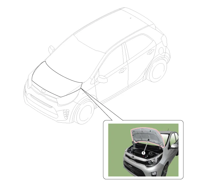 | 1. | Remove the hood assembly (A) after loosening the hood hinge mounting bolts.