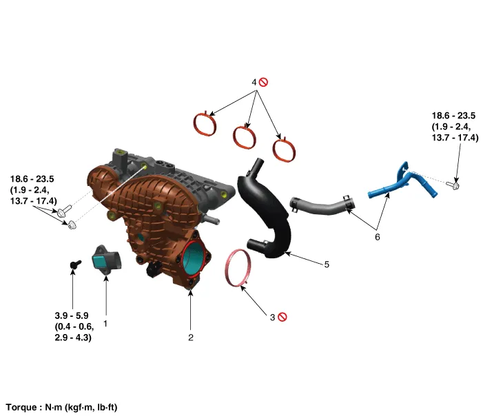 | 1. Manifold absolute pressure sensor (MAPS) 2. Intake manifold 3. Electronic throttle body control (ETC) module gasket | 4. Intake manifold gasket 5. Positive crankcase ventilation (PCV) hose 6. Vacuum hose & pipe |