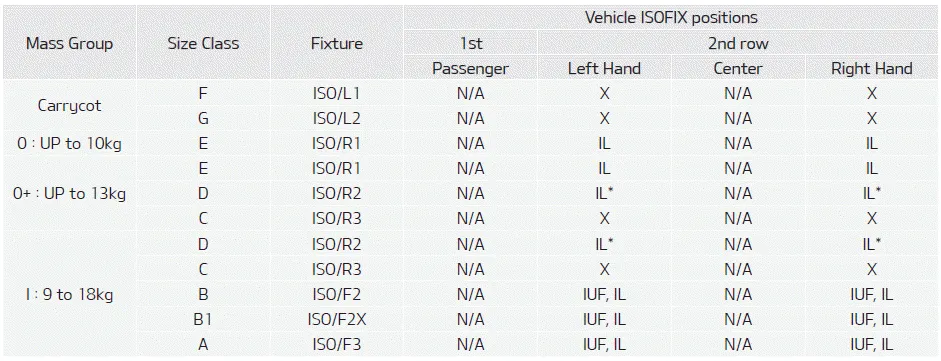 IL* = Suitable for particular ISOFIX child restraints systems (CRS) given in the