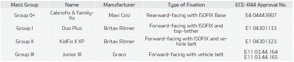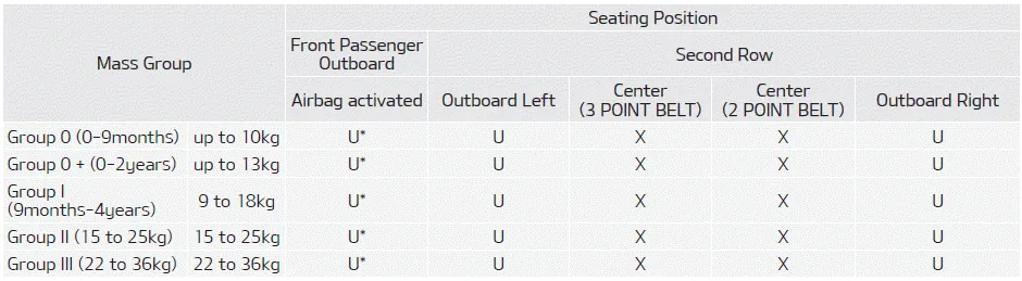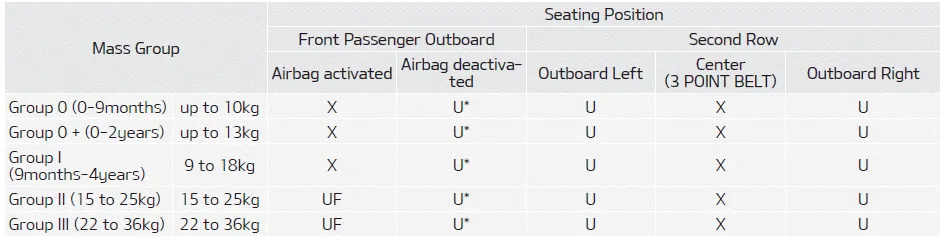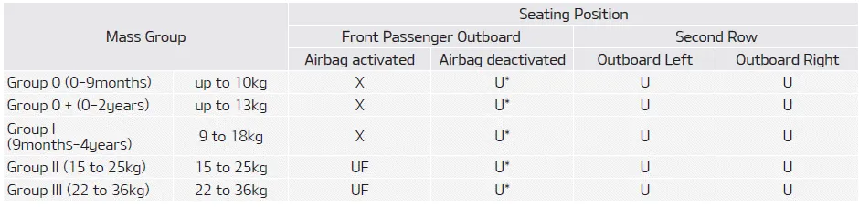 Use Child Restraint System that have been officially approved and are appropriate for your children. When using the Child Restraint System, refer to the following table.