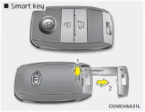 To remove the mechanical key, press and hold the release button (1) and remove the mechanical key (2).