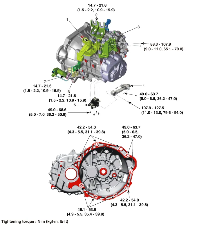 | 1. Control shaft complete 2. Control cable bracket 3. Transaxle support bracket 4. Roll rod bracket | 5. Roll rod support bracket 6. Clutch tube bracket 7. Clutch release cylinder assembly |