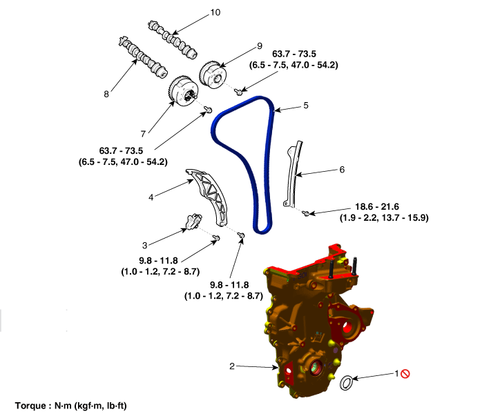 | 1. Front oil seal 2. Timing chain cover & oil pump assembly 3. Timing chain tensioner 4. Timing chain tensioner arm 5. Timing chain | 6. Timing chain guide 7. Exhaust CVVT assembly 8. Exhaust camshaft 9. Intake CVVT assembly 10. Intake camshaft |