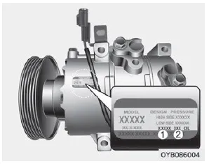 A compressor label informs you the type of compressor your vehicle is equipped with such as model, supplier part number, production number, refrigerant (1) and refrigerant oil (2).